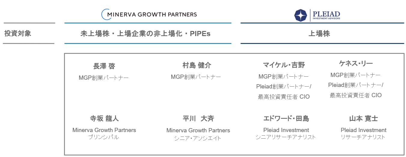 Minerva Growth Partnersは、メルカリでCFOを務めた長澤啓とモルガン・スタンレーでGlobal Internet Banking/Global Software Banking Group日本統括責任者を務めた村島健介が、Pleiad Investment Advisors※と共同で設立しました。