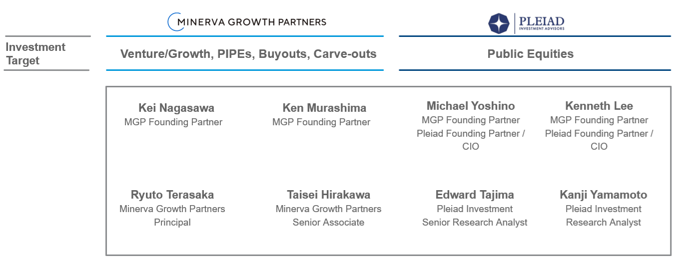 Minerva Growth Partners is established by Kei Nagasawa, former Mercari CFO, and Kensuke Murashima, former Head of Japan for Global Internet Banking/Global Software Banking Group at Morgan Stanley, together with Pleiad Investment Advisors*.